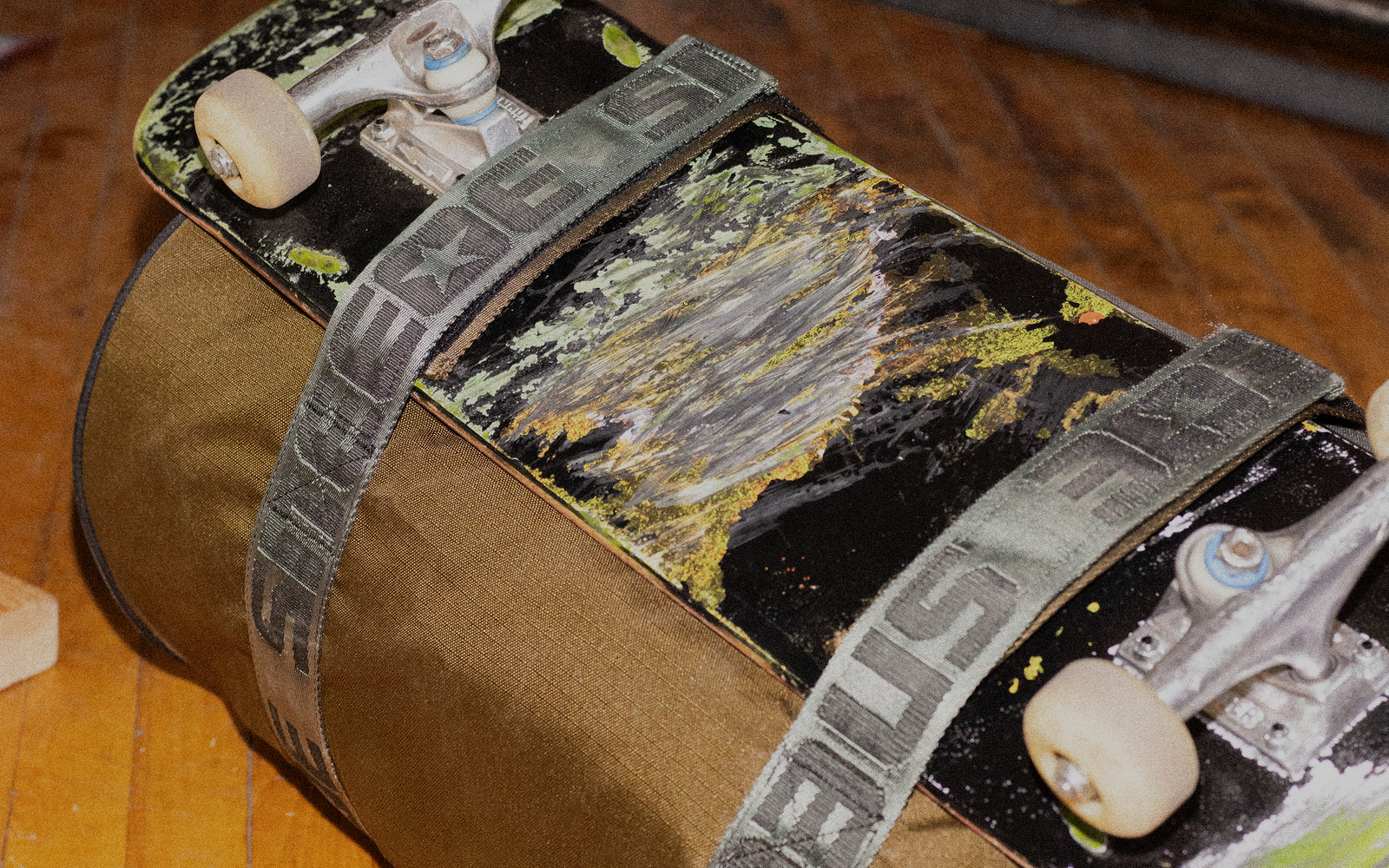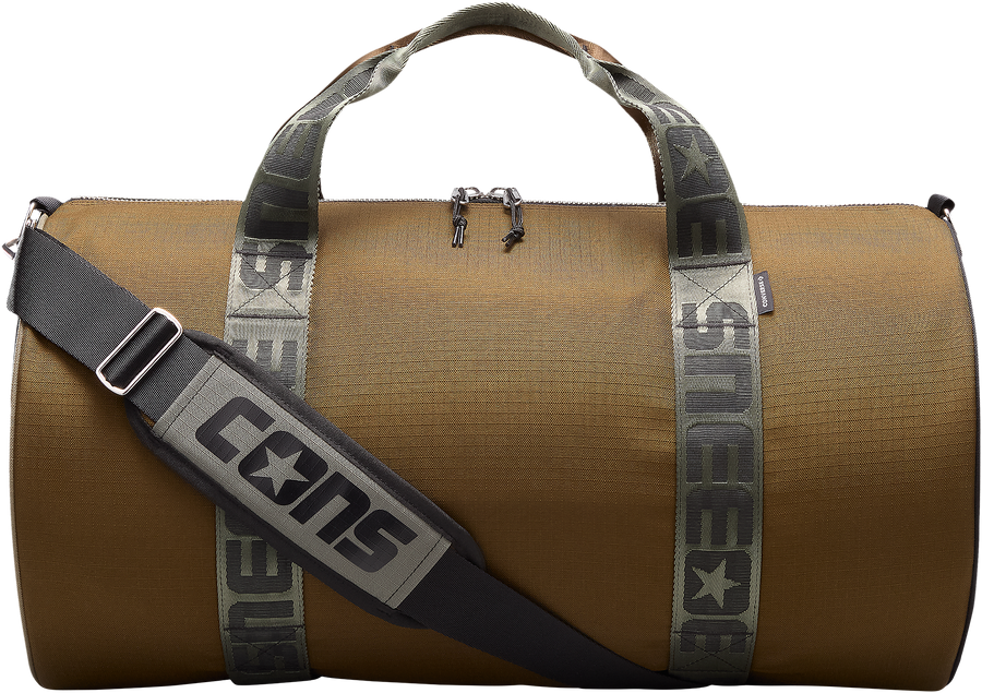 Colorblocked ripstop nylon. Dual zip main closure. Silver-tone hardware. Internal stash pocket. Adjustable carrying strap with padded shoulder. Co-branded woven handles and board straps with velcro closure. Screenprinted star on each side panel. Premium construction throughout. Measures 22" x 12" x 12".